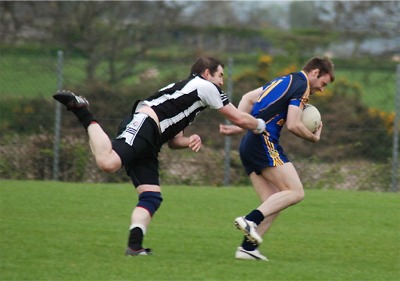 Two early frees from John Paul McCready were cancelled out with points from Gerard McColgan and a Diver free. By the 13th minute the teams were level at 0-4 apiece, with Aidan Lynch (after good work from Dermot Keaveney) and another Diver free for Naomh Pádraig drawing points from Eamon Bonner and Damian Melly in response.