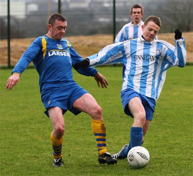 After early sparring, Stephen Doherty had Aileach on the attack, skipping clear and crossing for Graham Browne to fire wide from twelve yards. Browne was denied again soon after when his header was cleared off the line by John McCloskey following Darren McMonagle’s corner.