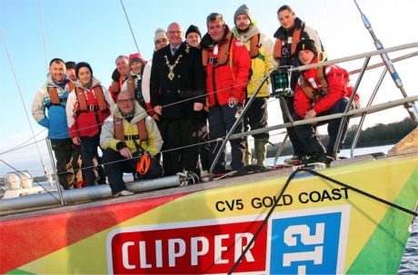 TRAINEES aboard the winning Round the World Race Gold Coast Clipper as it prepared to leave the Foyle Pontoon in Derry this morning. The candidates will undertake three days of Royal Yachting Association-accredited training along with crew members. The course is part of the legacy of the hugely successful Clipper Homecoming Festival in the city earlier this year. Included, from left, are sponsors Geraldine O’Hara, Kick Start to Work programme, Leeanne Thompson, Foyle Lough’s Agency, Paul Bryson, Foyle Port and Mayor of Derry, Cllr Kevin Campbell. Clipper Ventures will host an open day in early December for participants interested in signing up for future races.