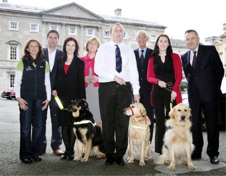 Pictured outside Leinster House are Irish Guide Dogs for the Blind (IGDB) trainer, Aoife Josh; Martin Haydon, Fine Gael Kildare South; Lean Kennedy with her guide dog, Murphy; Senator Mary Ann O’Brien, Kevin Kelly with his guide dog, Miles; Alan Dukes, IGDB chairman; Claire Hawkins with assistance dog, Gandon, and IGDB ceo, Padraig Mallon.