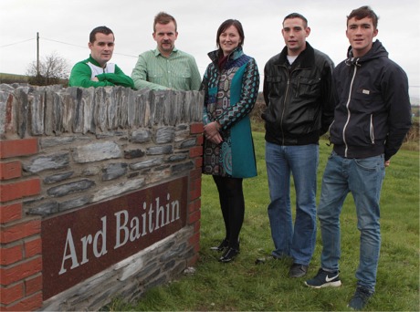 Mary Devlin, International Fund for Ireland, with volunteers Brian Coll, Gill Clarke, Damien Crossan and Shane Curran, volunteer mentor and youth worker (second from left) at the unveiling of the new sign at Ard Baithin, St. Johnston on November 15, 2013.