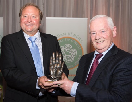 Former Governor of Montana, Brian Schweitzer, is presented with the 2013 Tip O'Neill Irish Diaspora Award by Minister Dinny McGinley.