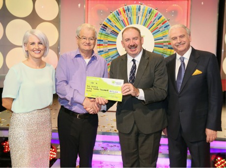Pictured, from left, are Sinead Kennedy, co-host; Alo Deery; Peter Plunkett, National Lottery and Marty Whelan, co-host. Alo bought his winning ticket in Spar, Main Street, Ennistymon, Co Clare.