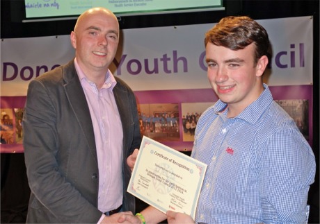 Jack Callaghan from Buncrana, receives his Certificate of Recognition at the Donegal Youth Council showcase on August 30. The certificates were presented by Donegal County Council cathaoirleach Cllr John Campbell.