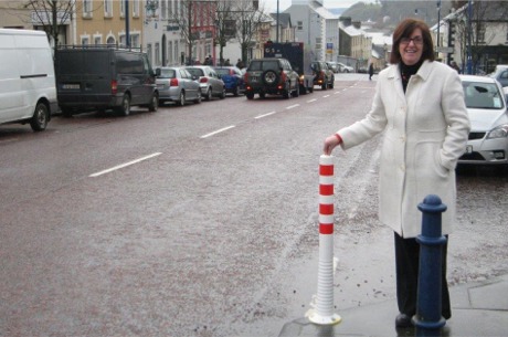 Mary McCauley pictured at some of the newly-installed bollards in Moville.