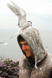 Star tern: An endangered roseate tern takes a peck at BirdWatch Ireland warden Brian Burke as he works on Rockabill Island off the coast of Dublin.