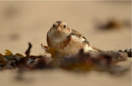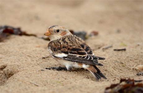 A beautiful Snow Bunting enjoys a day out at a local beach after arriving for its autumn holidays from Greenland.