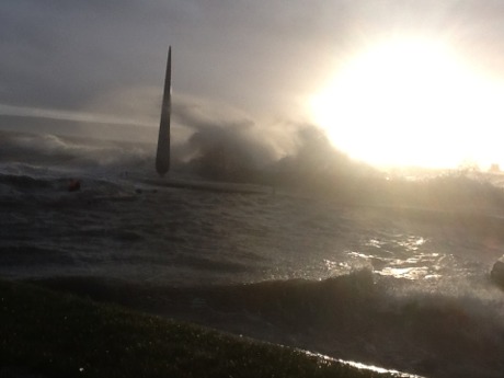 Severe storms flood Moville Pier at the Fid monument. Photo: Anthony Doogan.