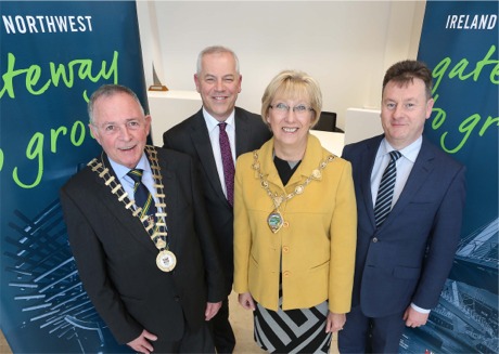 Mayor of Derry City and Strabane District, Alderman Hilary McClintock and Cathaoirleach of Donegal County Council, Cllr Terence Slowey pictured with CEOs of both councils, respectively, John Kelpie and Seamus Neely, as they launch the 2017 Trade and Investment Mission to Boston.