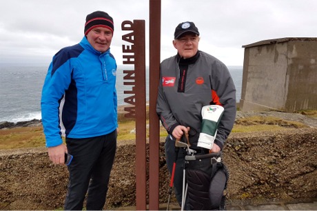 Nick Edmund, right, founder of GlobalGolf4Cancer, pictured at Malin Head at the start of of his Wild Atlantic Way challenge, with Ballyliffin Golf Club manager John Farren.