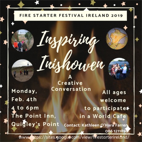 "Trying out something new is encouraged by Fire Starter" says Inspiring Inishowen host Kathleen O'Hara Farren. She invites all to experience conversation in an inspiring way and bring your inspiring thoughts and gifts... Simply put this is a gathering of people of all ages sitting drinking tea and chatting but deeper down this is a hive of creative ideas which may form our future here in Inishowen! A couple of hours of entertainment and conversation, World Cafe is one where you have rounds of conversations about what is inspiring you about where you live. You are invited to bring info and gifts to share. "I hope that creative and enterprising people in the community will attend to share and support others. I hope also that children will be well represented, as well as elders from all over Inishowen. This is a rare opportunity, in a time of great potential for us to come together and be inspired to take ourselves & Inishowen to the best possible way of living!" says Kathleen O'Hara Farren the Inspiring Inishowen event facilitator.