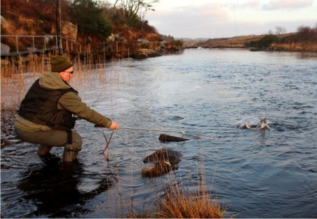 Michael McCann about to land the first salmon of the season on the Lackagh River, County Donegal on New Years Day.