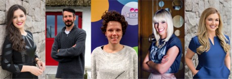 Campaí Cúla4 hosts from left to right, Orla Ní Fhinneadha, Diarmuid Ó Mathúna, Jules Ní Chonchubhair, Máire Treasa Ní Dhubhghaill and Caitlín Nic Aoidh.