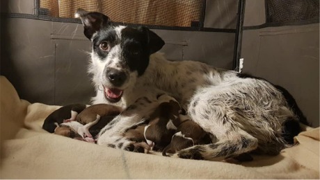 Cher, a pregnant terrier cross was found straying, alone, pregnant and abandoned on a cold day in December. She gave birth to 11 puppies.