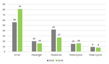 Casualty figures for 2019 show that while there has been a sharp drop in pedestrian deaths, down 15 or 36%, and passenger deaths, down 4 or 20%, there has been a worrying increase in the number of drivers killed, up 25 or 45%, compared to 2018.