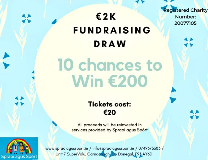SPRAOÍ agus Spórt has appealed to the local community to support their new €2K fundraising draw, which aims to help mitigate the impact of a second lockdown and enable the social enterprise from Carndonagh to continue providing its vital services for children & families throughout Inishowen during the coronavirus pandemic.