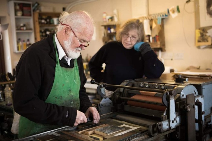 Here Ros paints and Tim makes handmade prints from his