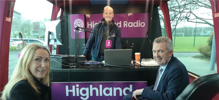 Anne McHugh, Chief Executive Donegal ETB, John Breslin, Highland Radio and Paul Hannigan, President LYIT preparing to go on air at the outside broadcast. Photo credit Highland Radio.