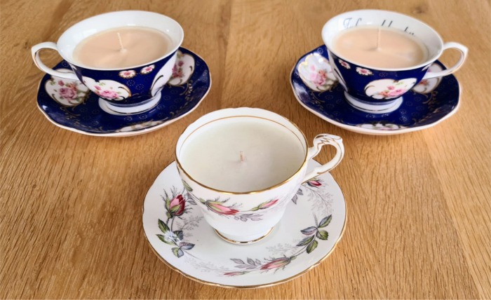 Síoraí teacup candles are created from salvaged china and soy wax.