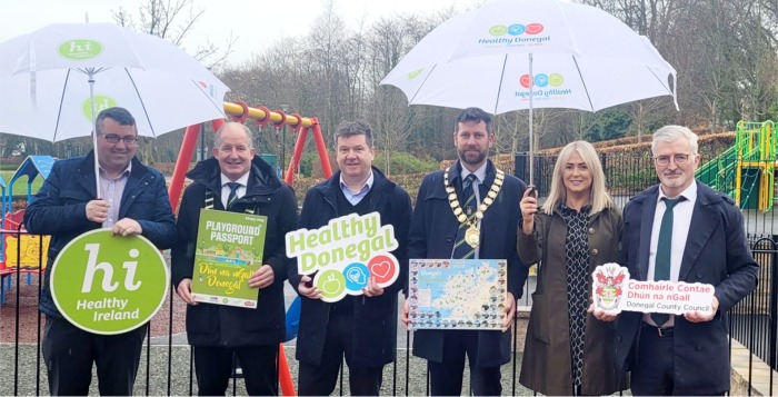The Launch of the Donegal Playground Passport. Pictured L-R: Paddy Doherty, Divisional Manager, Donegal County Council (DCC); Cllr. Liam Blaney, Cathaoirleach of DCC; Seamus Canning, Area Manager, DCC; Cllr. Donal Mandy Kelly, Mayor of Letterkenny-Milford Municipal District; Margaret Fitzgerald, Healthy Ireland Coordinator and John G. McLaughlin, Chief Executive, DCC.