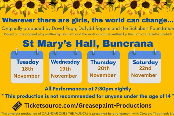 Calendar Girls – The Musical will be performed in St Mary’s Hall, Buncrana from Tuesday 18th November until Saturday 22nd November 2025 at 7:30pm nightly.