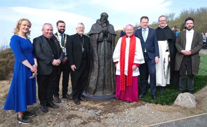 L-R Fiona Doherty, DCC; The Very Reverend Francis Bradley PP; Cllr Jack Murray, Cathaoirleach Inishowen MD; His Excellency Archbishop Luis Mariano Montemayor, Apostolic Nuncio and Dean of the Diplomatic Corps; The Most Reverend Donal McKeown, Bishop of Derry; Minister of State Charlie McConalogue TD; Father Damian Polly, OP, Dominican Friar & Prior of the Black Abbey, Kilkenny and Rory Harron, artist.