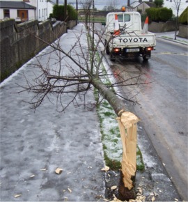 “We have had drunken fools causing damage to property in the past, but this is of a different nature altogether,” said town engineer Donal Walker. “The perpetrator or perpatrators took something like a hatchet to the trees and must have spent considerable time and energy in chopping them down.