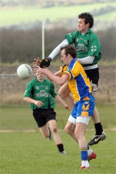 Burt extended their lead in bizarre fashion. From a position 35 metres from goal and near the right sideline Ronan McLaughlin lobbed a ball towards the Naomh Bríd posts. Keeper John Gallagher came away off his line to close down unmarked full forward Ciaran Dowds and watched in horror as ball bounced over his head and nestled in the corner of the net.
