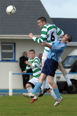 On 18 minutes Shaun Porter was alert to the danger sliding in to cut out Alan Friel’s ball into the box ahead of a pair of sky-blue shirted forwards.