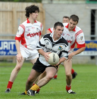 the outcome of the match might well have been different. It was all a far cry from the end of the first half when Malin seemed to be well in control, but the Inishowen side struggled to get the ball forward enough in the second half and only a combination of some good defending and poor finishing from Dungloe earned them the escape. Dungloe certainly started the game the brighter of the two sides and even though Stephen McLaughlin’s 2nd minute point cancelled out the opening score from Sean Bonner, it wasn’t long before Dungloe had stretched their lead. Stephen Flanagan pointed with a well-taken right foot strike and then a great cross field pass from Pauric Bonner set up Manus Brennan for a good point in the 7th minute. Bonner was causing Malin plenty of problems in the early stages, but with a number of wides and a number of |