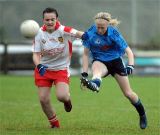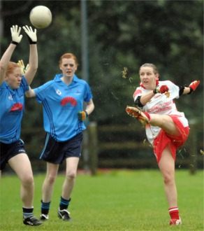 the board for Glenfin. Moville pulled away from their opponents after that, with Treasa Doherty hitting two points off either foot, sister Anita adding another and Niamh Hegarty winning and converting a free. The first goal arrived in unusual circumstances in the 14th minute. Anita Doherty hooked in a high ball from the left wing that flummoxed the Glenfin rearguard and Ciara Ward inadvertently kicked the ball past Sharon McGlynn and into her own net. Moville kept up the pressure with Treasa Doherty twice going close for goal – her first effort bounced off the top of the bar for a point while the other rebounded off the butt of the post and was cleared by the white and red defence. County star Yvonne McMonagle struck Glenfin’s first point in 15 |