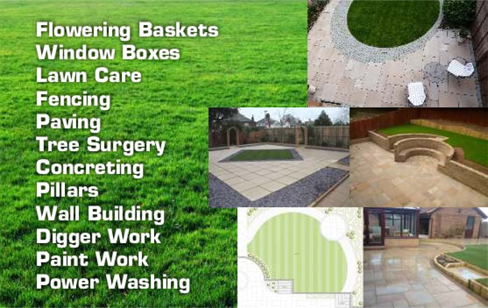 Our services include: Lawn care, fencing, paving, tree surgery, concreting, pillars, wall building, digger work, paint work and power washing. Hanging baskets and window boxes also supplied.